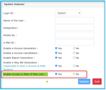 Select the sub-user from the list. A new option ‘Access to the IRNs of the Main User’ is provided. In case, the main user wants to give access to IRNs generated by him to the sub-user then he can select ‘Yes’ to this option. Note that along with this, one or all options such as Cancel, View report and e-Waybill generation need to be provided. For example, if Enable Access to IRNs of main user is selected as ‘Yes’ and Enable e-Invoice Cancellation is selected as Yes then sub-user can cancel the IRNs generated by Main user also.