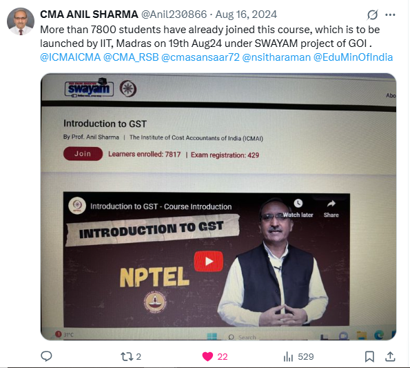 - GST Course launched by IIT, Madras on 19th Aug24 under SWAYAM project of GOI