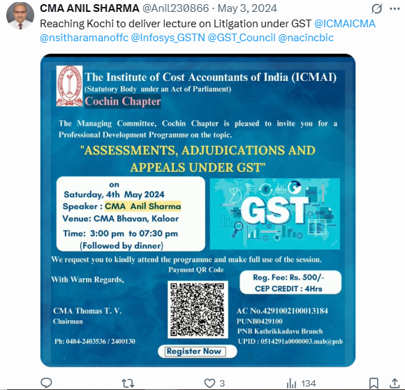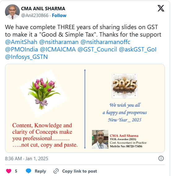 Dr. CMA Anil Sharma is already on a mission to simplify the complex GST Law. In this direction, he has shared/posted 800+ slides containing information on GST Act /Rules/ Circulars etc. The GST provision in one slider format /capsule is been appreciated by various Tax Professionals. It aid in learning GST by tax professional, taxman, accountants, students etc. All the slides are posted in Online Tax Update portal -> GST Notes. He also shares daily slides on GST law in his WhatsApp channel