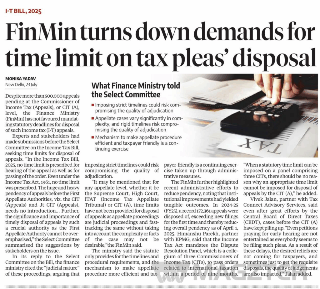Experts and stakeholders had made submissions before the Select Committee on the Income Tax Bill, seeking time limits for disposal of appeals. “In the Income tax Bill, 2025, no time limit is prescribed for hearing of the appeal as well as for passing of the order. Even under the Income tax Act, 1961, no time limit was prescribed. The huge and heavy pendency of appeals before the First Appellate Authorities, viz. the CIT (Appeals) and Jt CIT (Appeals), needs no introduction.. Further, the significance and importance of timely disposal of appeals by such a crucial authority as the First Appellate Authority cannot be over-emphasised,” the Select Committee summarised the suggestions by stakeholders on the issue.