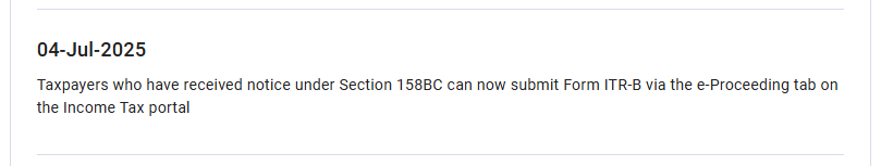 A taxpayers who have received notice under Section 158BC can now submit Form ITR-B via the e-Proceeding tab on the Income Tax portal
