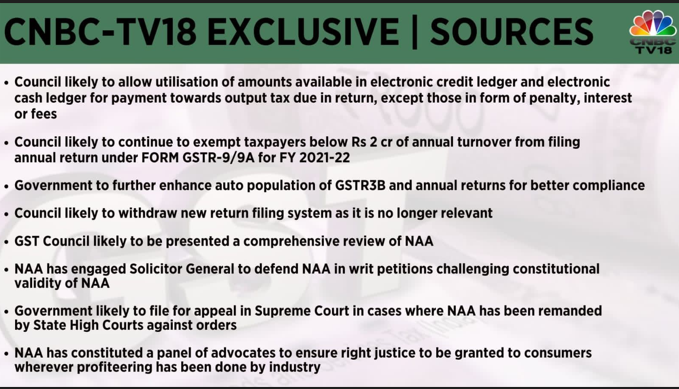 - GST Council likely to allow utilisation of amounts available in electronic credit ledger and electronic cash ledger for payment towards output tax due in return, except those in form of penalty, interest or fees