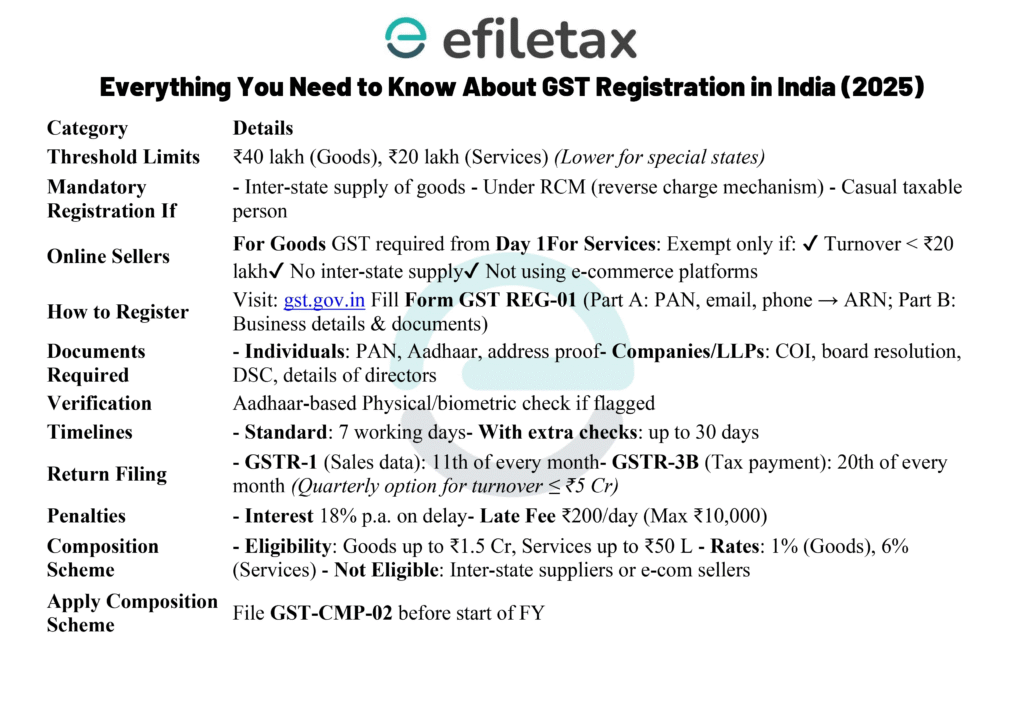 Social media platform efiletax recently posted that GST registration rules for 2025 and noted that registration isn’t optional if you cross these thresholds or sell online from Day 1.