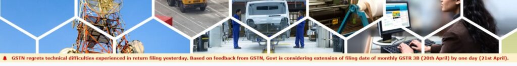 GSTN regrets technical difficulties experienced in return filing yesterday. Based on feedback from GSTN, Govt is considering extension of filing date of monthly GSTR 3B (20th April) by one day (21st April).