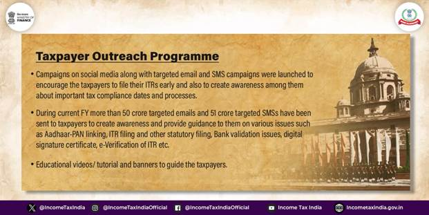 - During current FY more than 50 crore targeted emails and 51 crore targeted SMSs have been sent to taxpayers to create awareness and provide guidance to them on various issues such as Aadhaar-PAN linking, ITR filing and other statutory filing, Bank validation issues, digital signature certificate, e-Verification of ITR etc.