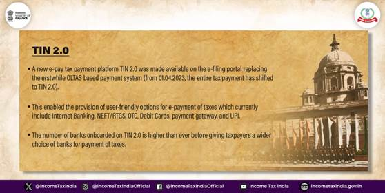 - A new e-pay tax payment platform TIN 2.0 was made available on the e-filing portal replacing the erstwhile OLTAS based payment system (from 01.04.2023, the entire tax payment has shifted to TIN 2.0).