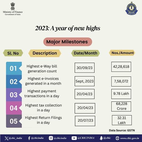 The Central Board of Indirect Taxes and Customs (CBIC), Department of Revenue, Ministry of Finance, has achieved significant milestones in enhancing the efficiency and integrity of the Goods and Services Tax (GST) system. Goods and Services Tax (GST) not only completed six successful years of implementation but also broke all records of previous collections and achieved the highest ever tax revenue collection for April 2023 at Rs 1.87 lakh crore.