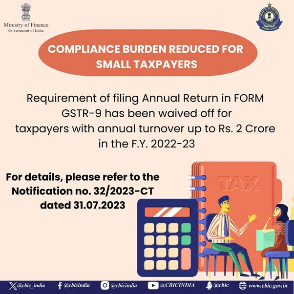 AS A RELIEF TO THE TAXPAYERS FROM HIGH LATE FEES, vide Notification No. 07/23-CT dated 31.03.2023, late fee payable for delayed filing of FORM GSTR-9 / GSTR-9C for FY 2017-18 to FY 2021-22 was capped to maximum of Rs. 20,000/- (Rs. 10,000/- + Rs. 10,000/-) if filed between 01.04.23 to 30.06.23 and the due date was further extended till 31.08.2023 vide Notification No. 25/2023-CT dated 17.07.2023. Further, vide Notification No. 08/23-CT dated 31.03.2023, late fee payable for delayed furnishing of final return in FORM GSTR-10 was capped to maximum of Rs. 1,000/- (Rs. 500/- + Rs. 500/-) if filed between 01.04.23 to 30.06.23 and the due date was further extended till 31.08.2023 vide Notification No. 26/2023-CT dated 17.07.2023.
