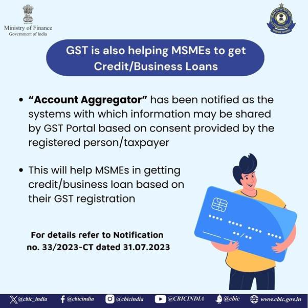 VIDE NOTIFICATION NO. 33/2023-CT dated 31.07.2023, ‘Account Aggregator’ has been notified as the systems with which information may be shared by the common portal based on consent provided by the registered person/taxpayer. This will help MSMES in getting credit/business loan based on their GST registration.