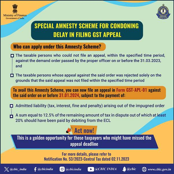 AMNESTY SCHEME FOR FILING OF APPEALS AGAINST DEMAND ORDERS IN CASES WHERE APPEAL COULD NOT BE FILED WITHIN THE ALLOWABLE TIME PERIOD: The Council has recommended providing an amnesty scheme for taxable persons, who could not file an appeal under section 107 of the CGST Act, 2017 against the demand order passed on or before the 3lst day of March, 2023, or whose appeal against the said order was rejected solely on the grounds that the said appeal was not filed within the time period specified in sub-section (1) of section 107. In all such cases, filing of appeal by the taxpayers will be allowed against such orders upto 31st January 2024, subject to the condition of payment of an amount of pre-deposit of 12.5% of the tax under dispute, out of which at least 20% (i.e. 2.5% of the tax under dispute) should be debited from Electronic Cash Ledger. This will facilitate a large number of taxpayers, who could not file appeal in the past within the specified time period.