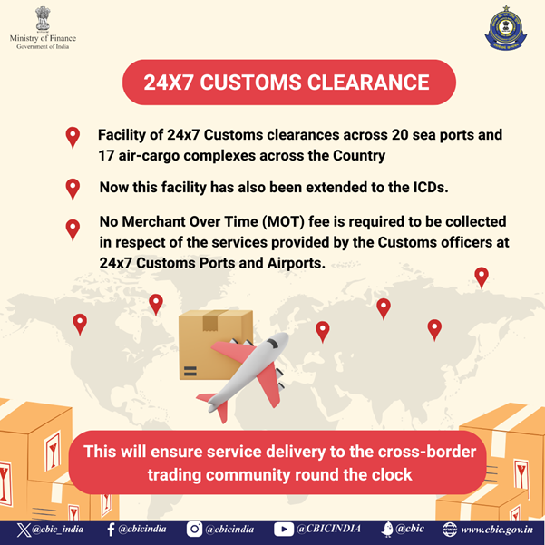 24*7 CUSTOMS CLEARANCE: Indian Customs is committed to ensure service delivery to the cross-border trading community round the clock. In this endeavour, the CBIC has enabled the facility of 24×7 Customs clearance across numerous seaports and air cargo complexes across the country. Presently, this facility is available at 20 seaports and 17 airports. Further, no Merchant Over Time (MOT) charges are required to be collected in respect of the services provided by the Customs officers at 24 X 7 Customs Ports and Airports. Now this facility has also been extended to the ICDS. (Refer Circular No. 11/2022-Customs dated 29.07.2022)