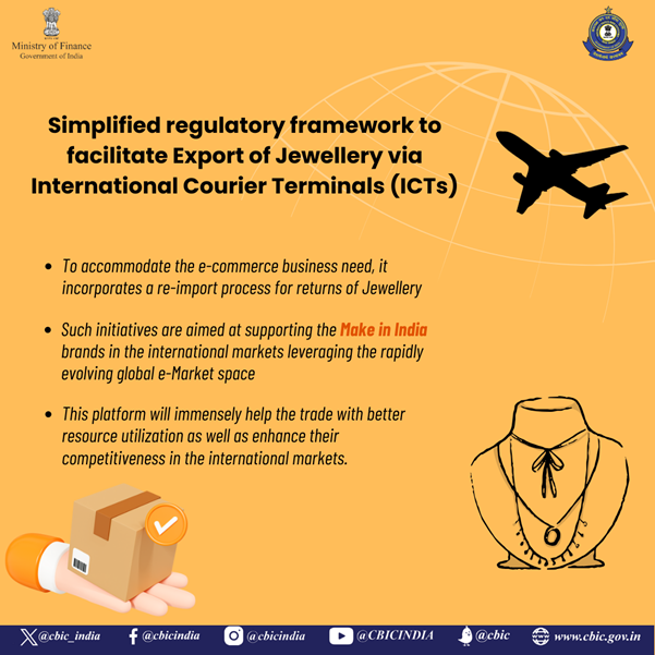E-COMMERCE PROCEDURE FOR JEWELLERY RE-IMPORT: Implementation of a simplified regulatory framework to facilitate export of Jewellery through e-Commerce was announced in the Budget for the year 2022. Accordingly, CBIC has laid down a simplified regulatory framework for e-Commerce exports of Jewellery via International Courier Terminals (1CTS). To accommodate the e-commerce business need, it incorporates a reimport process for returns of Jewellery. The procedural and legislative changes introduced for facilitating e-Commerce exports of Jewellery through Courier Terminals are aimed at supporting the Make in India brand in the international markets and enhancing the competitiveness of Indian Jewellery exports leveraging the rapidly evolving global e-Market space. (Refer Circular No. 09/2022-Customs dated 30.06.2022).