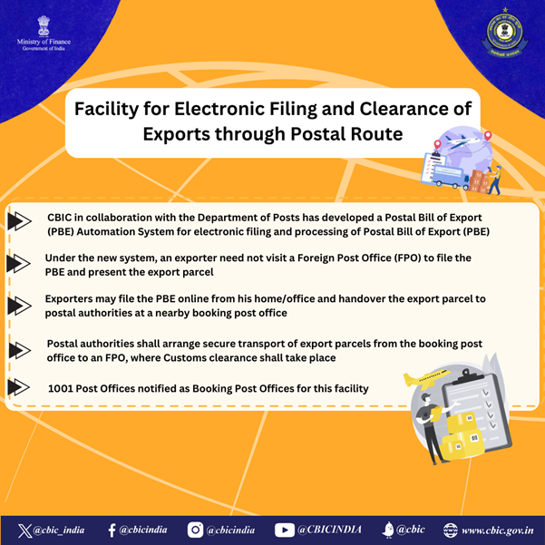 ELECTRONIC FILING AND CLEARANCE OF EXPORTS THROUGH POSTAL ROUTE: Department of Posts, in collaboration with CBIC, has developed a Postal Bill of Export (PBE) Automation System for electronic filing and processing of Postal Bill of Export (PBE). Under the new system, an exporter need not visit a Foreign Post Office (FP0) to file the PBE and present export parcel. Rather, he is enabled to file the PBE online from his home/office and handover the export parcel to postal authorities at a nearby booking post office. Postal authorities shall arrange secure transport of export parcel from booking post office to an FPO, where Customs clearance shall take place. (Electronic Declaration and Processing) Regulations, 2022 have been notified. (Refer notification 104/2022-Customs N.T. dated 09.12.2022)