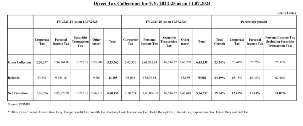 The Central Board of Direct Taxes on Friday released the data on Direct Tax (DT) collections till July 11, 2024, for FY 2024-25. The net direct tax collections have increased by 24.07% to Rs 5.74 lakh crore. In FY23, the net collections stood at Rs 4.80 lakh crore.