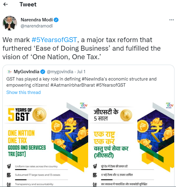 “We mark #5YearsofGST, a major tax reform that furthered ‘Ease of Doing Business’ and fulfilled the vision of ‘One Nation, One Tax.’”