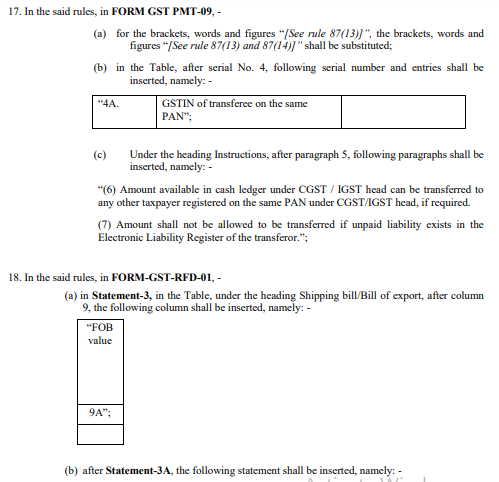 “(14) A registered person may, on the common portal, transfer any amount of tax, interest, penalty, fee or any other amount available in the electronic cash ledger under the Act to the electronic cash ledger for central tax or integrated tax of a distinct person as specified in sub-section (4) or, as the case may be, sub-section (5) of section 25, in FORM GST PMT09: