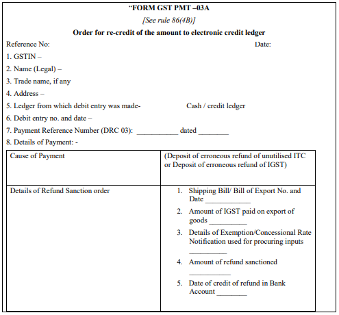 along with interest and penalty, wherever applicable, through FORM GST DRC-03, by debiting the electronic cash ledger on his own or on being pointed out, an amount equivalent to the amount of erroneous refund deposited by the registered person shall be re-credited to the electronic credit ledger by the proper officer by an order made in FORM GST PMT-03A.”;