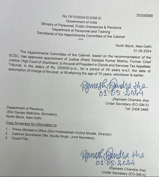 The Government of India, appoints Justice (Retd.) Sanjaya Kumar Mishra, Former Chief Justice, High Court of Jharkhand, to the post of President in Goods and Services Tax Appellate Tribunal, for a period of 4 years w.e.f. the date of assumption of charge of the post, or till attaining the age of 70 years, whichever is earlier.