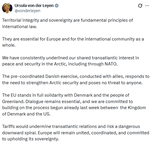 “Territorial integrity and sovereignty are fundamental principles of international law. They are essential for Europe and for the international community as a whole… The EU stands in full solidarity with Denmark and the people of Greenland. Dialogue remains essential, and we are committed to building on the process begun already last week between the Kingdom of Denmark and the US,” she said.