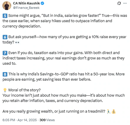 In a recent post on X, Kaushik gave a blunt reality check, reminding us that true income depends on what remains after inflation, taxes, and currency drops.