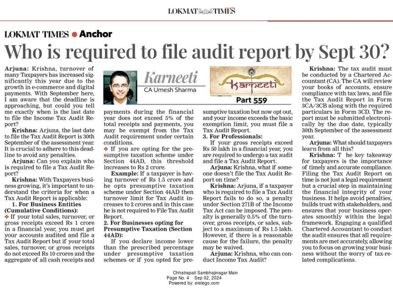 Author CA Umesh Sharma in his Karneeti Part 559 published in LOKMAT TIMES writes on topic “Who is required to file audit report by Sept 30?